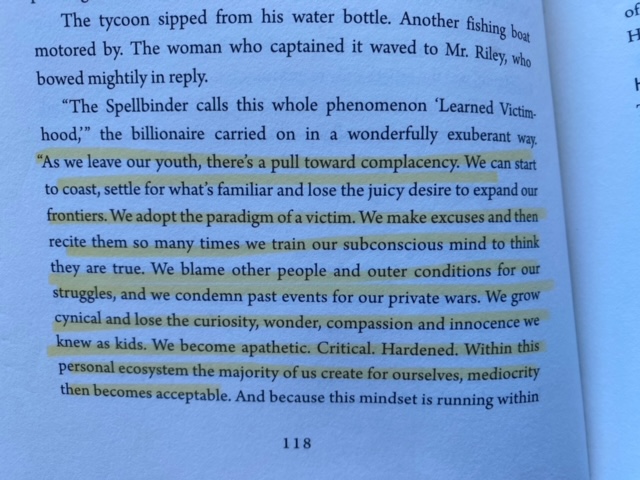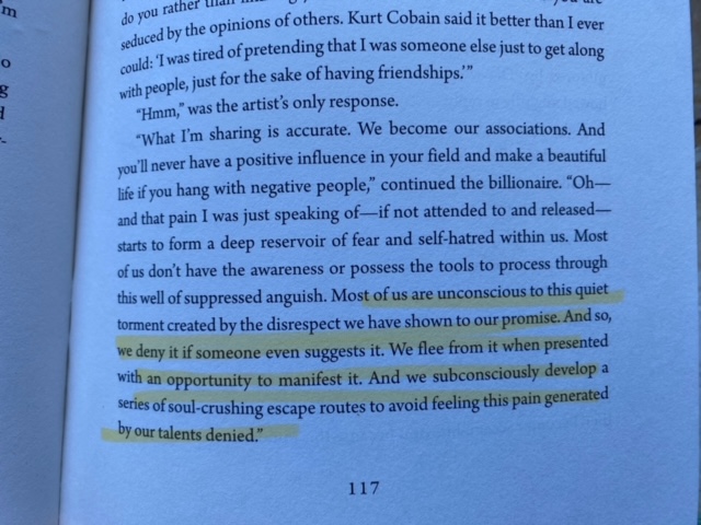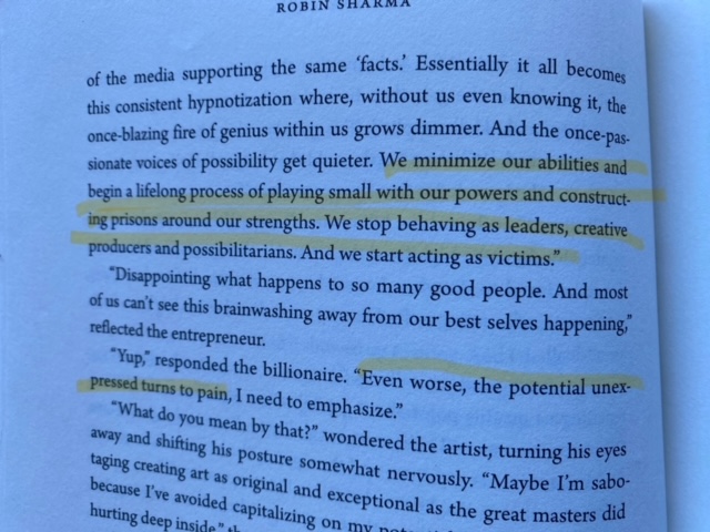 I was reminded of this recently because I’m reading The 5am Club by Robin Sharma. It took me a long time to come around to reading this book. I have been getting up at 5am for years as a part of my “carving out some me-time” routine, I didn’t think the book was necessary. Anyway, long story short, it’s not at all as I assumed it to be (assumptions being what they are…). One of the characters in the book is an artist, and the highlighted text in the images all reflect this same story of being born with something inside of us, and how that something gets worked out of us along the journey of growing up (usually by people who mean well). And then it becomes the work of the individual to bring that something back in. Or not. It’s a choice, after all. But on one side of that choice there is stress and displacement, and on the other side, there is a feeling of comfort, and glimmers of joy. On one side, imprisonment, on the other, freedom.