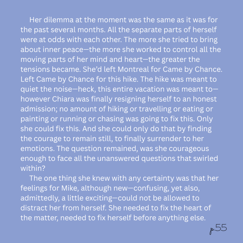 Used to going through life alone, expectations are low when they meet in this quiet village, despite their hidden but mutual attraction. Chiara intends on spending her days reflecting by the ocean and her nights painting. Mike intends on spending his days just as reclusively as always. However, the fact that the house Chiara rented makes her Mike’s new temporary neighbour makes it impossible for them to go their own individual ways. Through proximity, they can’t help but get to know one another, but Chiara can feel there is something lurking under the surface. The painful events from Mike’s past must be resolved before he can ever fully open to Chiara. When an unexpected phone call changes everything for Chiara in an instant, it is uncertain as to whether Mike has waited too long.